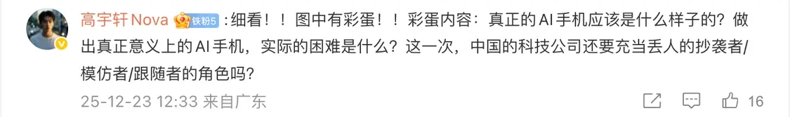 评论区有细心的网友留意到,海报中间还藏着三行透明度很高的小字:真正的AI手机究竟该是什么模样?打造出真正意义上的AI手机,实际会面临哪些困难?这一次,中国的科技公司难道还要扮演丢人的抄袭者、模仿者或是跟随者的角色吗?