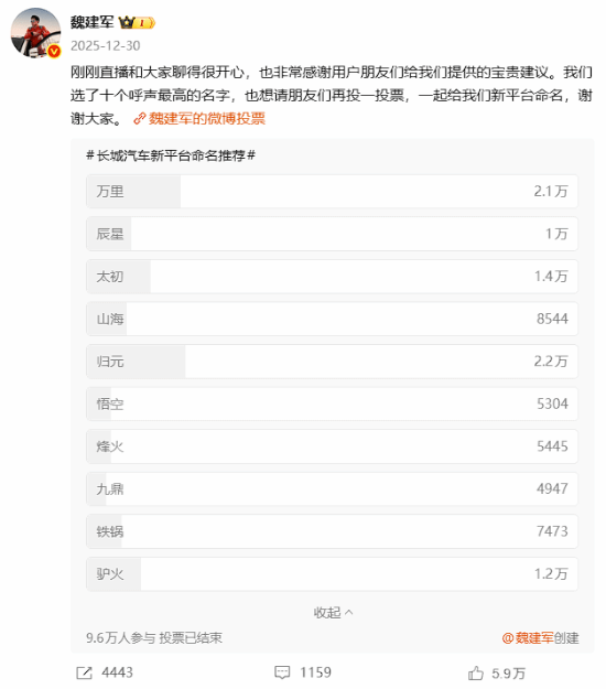 据了解,长城汽车新平台的征名活动官方披露共有9.6万人参与投票,总票数累计达11.2万,而“归元”凭借2.2万的最高得票数,最终成为该新平台的命名。
