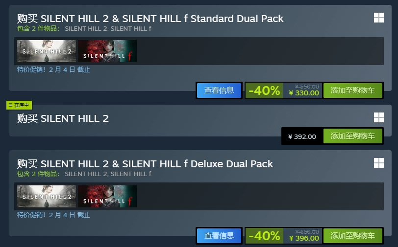 另外还出售包含豪华版内容的《寂静岭f+寂静岭2:重制版》豪华版捆绑包,购买时请留意避免重复购买。