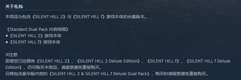 需要注意的是,根据官方说明,这个捆绑包不支持补差价升级,即便玩家已经持有《寂静岭2:重制版》、《寂静岭2:重制版》豪华版、《寂静岭f》或《寂静岭f》豪华版,仍然能够购买该商品,还请玩家留意,以防重复购买。