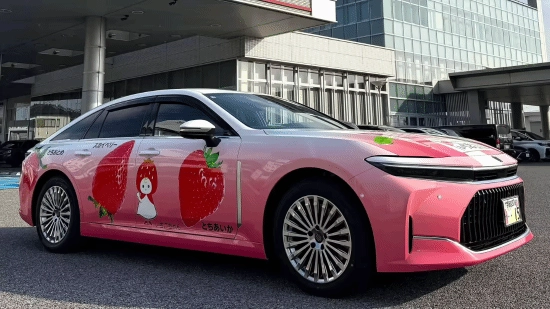 丰田皇冠轿车往往呈现出黑色或灰色的沉稳外观,常作为日本的警车或出租车在街头往来。栃木丰田推出的Ichigo Crown则颠覆了这一固有印象,其一是为了庆祝自身成立80周年,其二是向栃木县“日本草莓产量榜首县”的身份致敬。