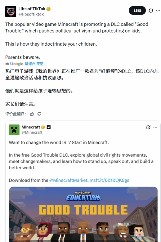 公告发出才短短几个小时,评论区就变成了激烈的舆论交锋场,争议的热度迅速攀升。不少玩家和家长都站出来批评,觉得这个DLC其实就是“政治宣传工具”,还怀疑Mojang是想通过游戏给孩子灌输民权激进主义的理念。有的用户直接说“别让这种政治宣传待在Minecraft里”,也有家长表示“游戏本来是给孩子玩的,不该让他们被政治内容包围,我可不想我的孩子接触这些”。有名的游戏主播Syndicate转发了公告,还疑惑地问“这到底是怎么回事”,光是这一条转发就有480万的浏览量,让争议变得更大了;账号Libs of TikTok更是发帖子指责,说Minecraft“在给孩子推行政治激进主义和抗议活动,这是在给孩子洗脑”,这条帖子的浏览量超过25.4万,引得更多人跟着质疑起来。