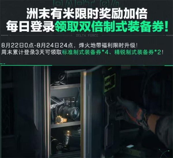 限时福利加倍啦!8月22日到8月24日期间登录,就能领取双倍制式装备券,还有额外奖励可以拿哦~