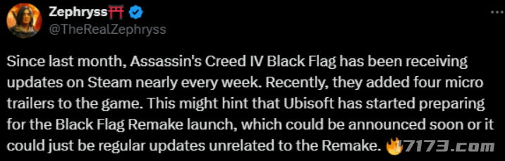 近日,有海外游戏圈内的“舅舅党”爆料,经典游戏《刺客信条:黑旗》的重制版很快就要正式公布了。之所以会有这样的猜测,是因为过去几个月里,《刺客信条:黑旗》的原版在Steam平台上更新得十分频繁,特别是6月21日那次更新的安装包中,还出现了4段全新的“微型预告片”。种种迹象都在暗示,育碧或许正在为这款经典作品的重制版进行最后的筹备工作。