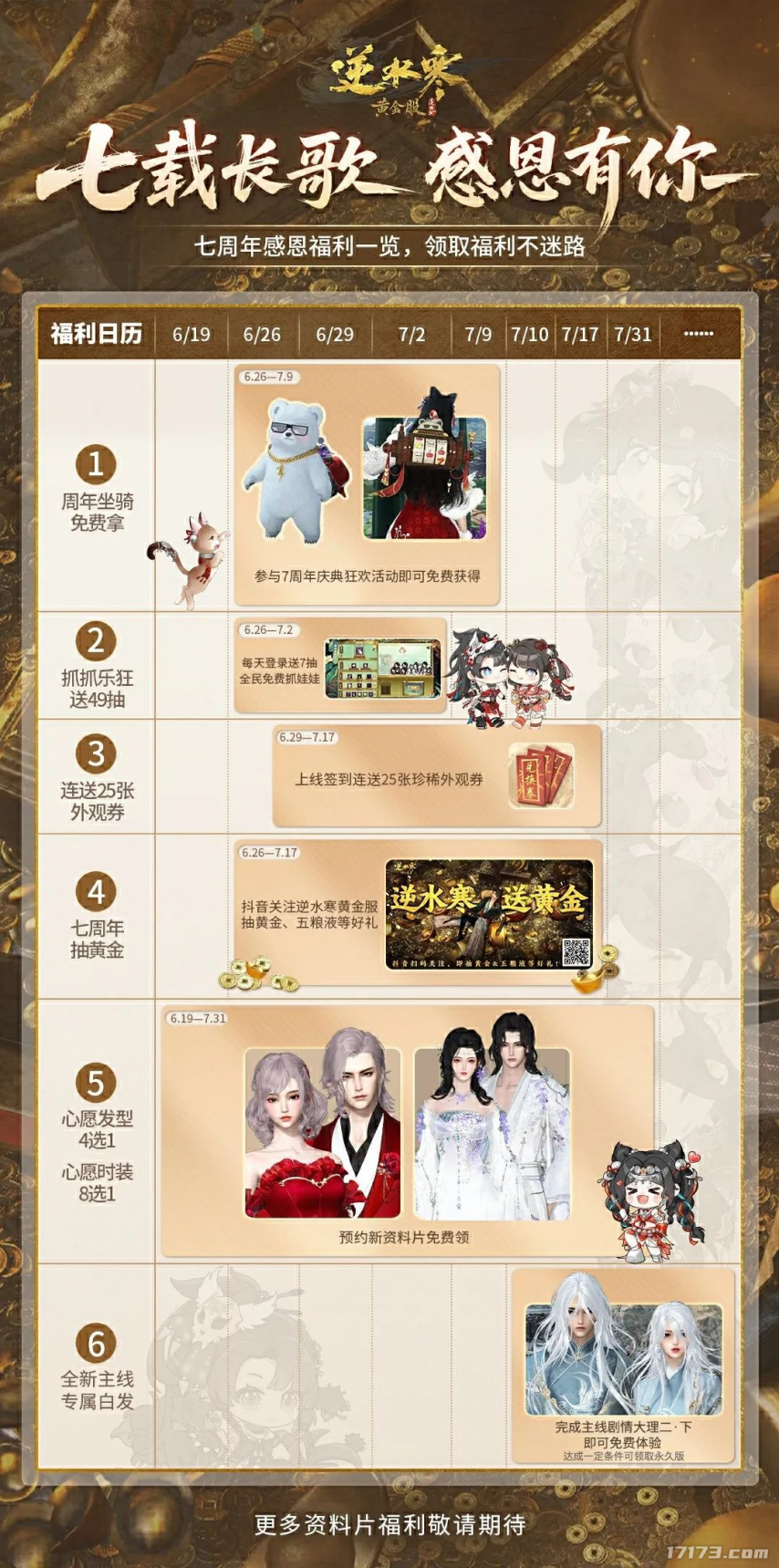 6月26日,《逆水寒》端游七周年庆典正式拉开帷幕,等级达到40级及以上的玩家,可经由主界面顶部的【周年庆典】入口进入活动页面,参与各项周年庆活动,赢取丰厚奖励,其中包含七周年专属限定的北极熊祥瑞【街头旋风】、【珍稀外观兑换券】以及【浮光霓裳自选匣】等诸多好礼。
