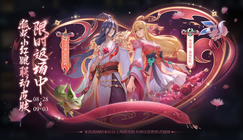 2025年8月28日至9月3日期间,少司缘-涂山红红与大司命-东方月初这两款皮肤将以直售形式返场,玩家可使用绑定点券兑换获取;需要注意的是,此次返场结束后,它们将不再以直售方式回归。此外,与之相关的联动语音及播报资源也会在同一时间段同步返场。