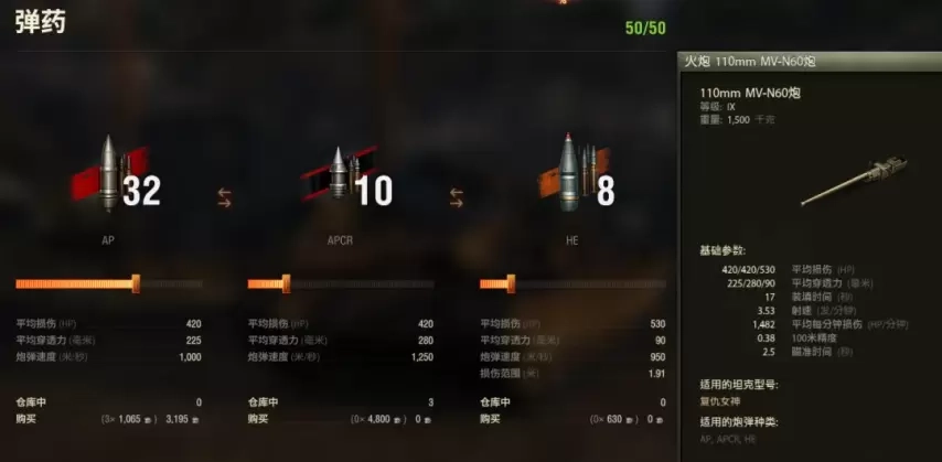 复仇女神同样属于“重炮中坦”范畴,和之前推出的122 TM、MKpz.68P采用了如出一辙的设计思路。它配备的主炮在单发伤害与穿深上具备一定优势,但相应地,装填速度与炮控表现会有所牺牲。这门110毫米口径主炮拥有420点单发伤害,银币AP弹225的穿深与1000的弹速均表现不俗;金币弹为穿深280的APCR,性能同样出色;此外还有穿深90的高穿HE弹。整体而言,其弹种配置颇具优势,硬数据方面没有明显短板。不过,似乎除了这些亮点之外,就再无其他突出表现了。