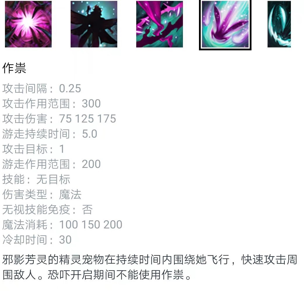 邪影芳灵会释放她的精灵宠物去威慑敌人。在短暂延迟后,目标区域内的所有敌人都会陷入恐惧状态,朝着己方泉水的方向疯狂逃窜。需要注意的是,在作祟技能生效期间,恐吓技能无法使用。此外,该技能效果可以被任何驱散类技能解除。