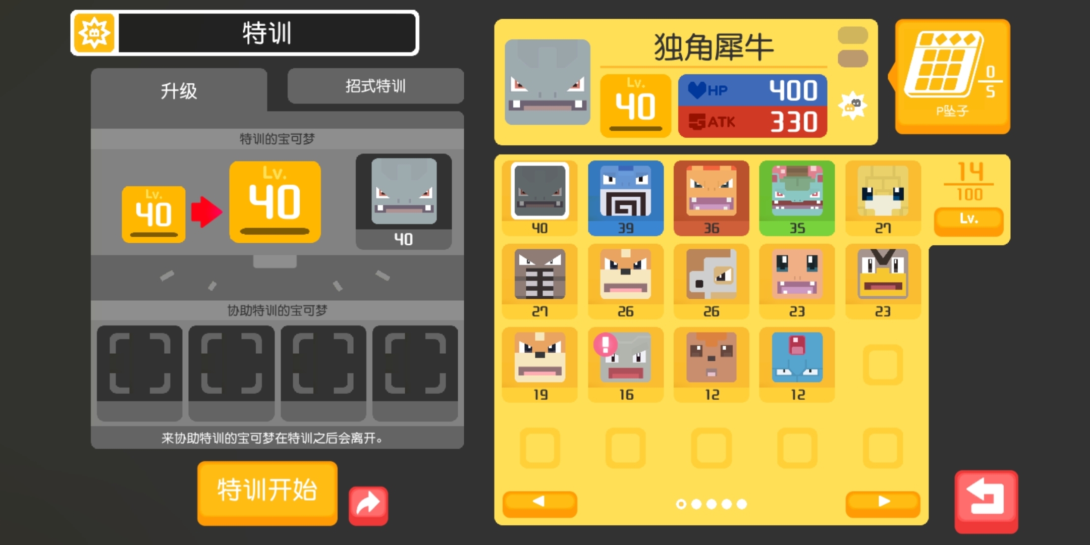 特训是消耗宝可梦以获取经验的方式,玩家最多可安排四只宝可梦协助特训,提升的经验值由协助宝可梦的等级和P石槽数量决定。特训完成后,参与协助的宝可梦会消失,此外玩家还能通过特训来锻炼宝可梦的招式呢~