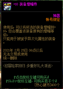 其中比较亮眼的奖励当属+10增幅券,它的实用性很强:对于还没达成全身红10的玩家来说,能用来填补缺口凑齐红10;而已经全身红10的玩家,则可以试着冲击更高增幅,就算失败了,也能用这张+10增幅券保住当前的红10基础。