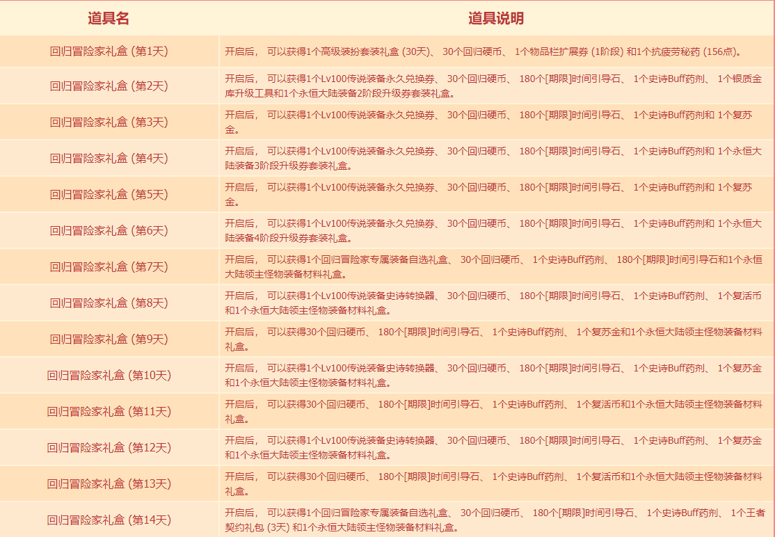 首先来看看回归玩家的奖励内容:回归玩家可以参与回归签到活动,该活动持续十五天,每天都能领取回归硬币和大量时间引导石,部分签到天数还能获得适配当前版本的传说装备等奖励,内容相当丰富,此外还有回归光环可以领取。