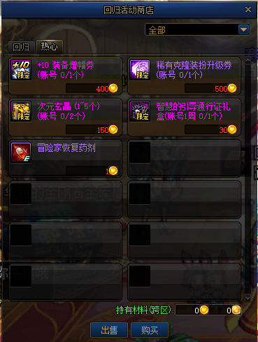 接下来要介绍的是热心玩家专属的福利内容。这类福利仅能通过商店兑换获取,兑换时需消耗热心币,提供的奖励颇为丰厚,包含+10增幅券、次元玄晶等实用道具。