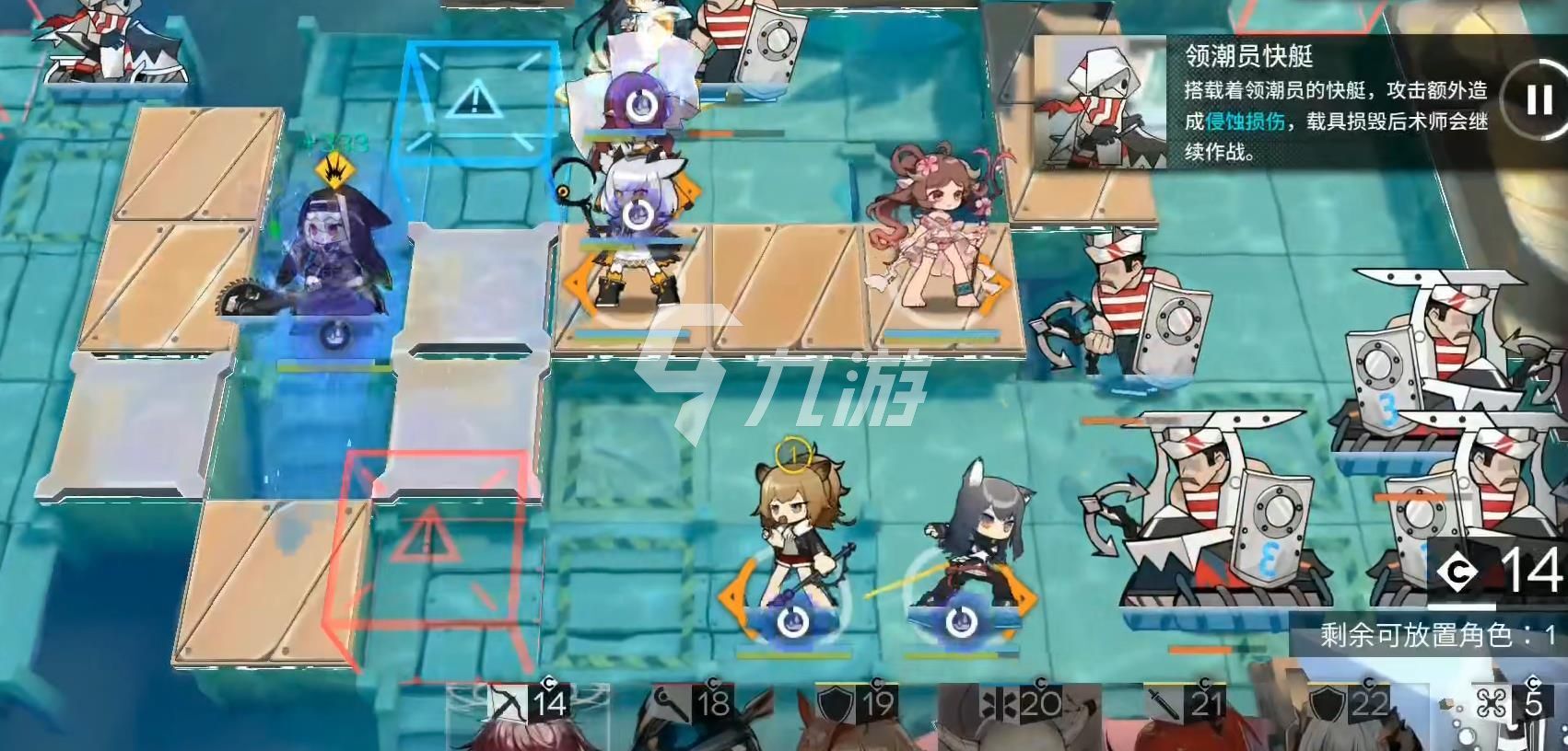 紧接着,把克罗斯放在最下方的位置,前方补上群卫;快艇水手这边不用太担心,他们进不了我们的阵地,之后把他们击落下船就行。涨潮时我们撤退,敌人会被潮水淹死。最后等大盾的冷却时间结束后更换奶盾,然后等待战斗结束就可以了。