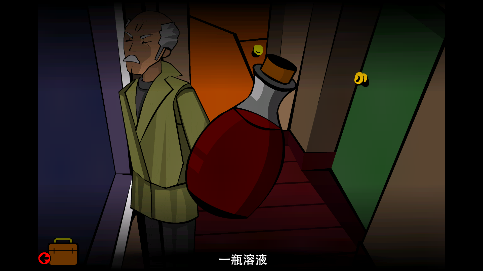 在上一关,我们了解到小人像实际上是一块陨石,而且它能够用来制作恐怖武器。尽管你进行了劝阻,博士依然没有听从,所以我们得回到博士的家中,寻找一件能够毁掉小人像的物品。我们先前往博士家的二楼,之后会遇到一位不明身份的老人,这位老人会交给你一把绿色的钥匙。