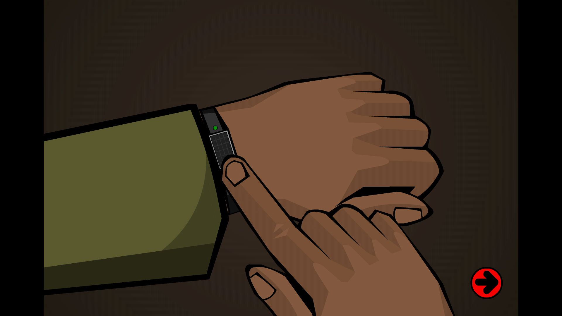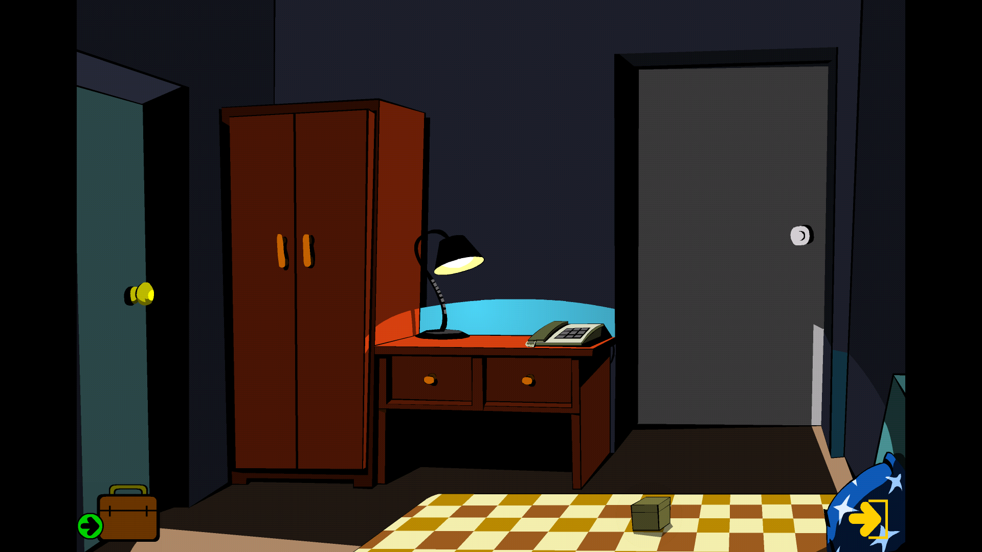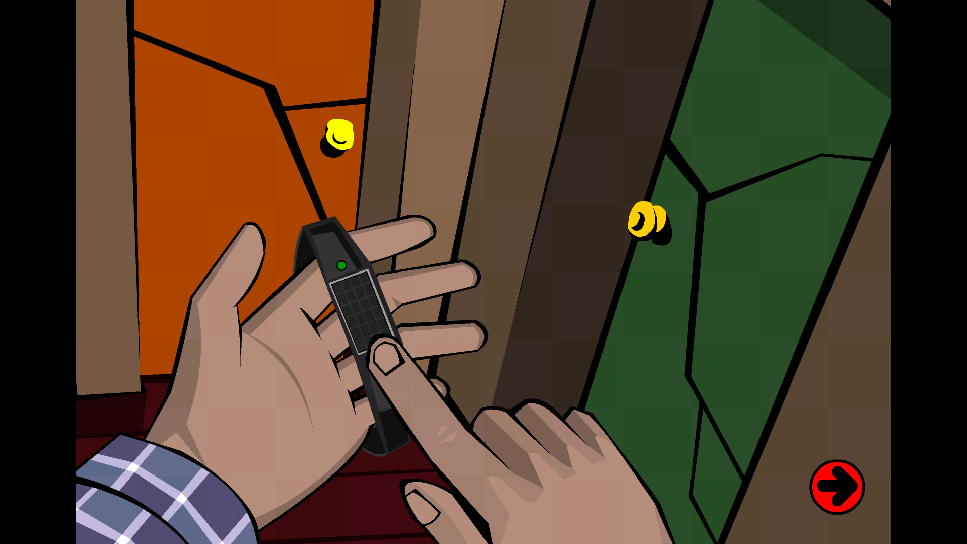 然后我们能看到老人佩戴着一块手表,这块手表实际上是一个穿越装置,老人借助这块腕表将我们传送到了楼上。同学们请先打开身旁那扇绿色的门,接着进入室内。
