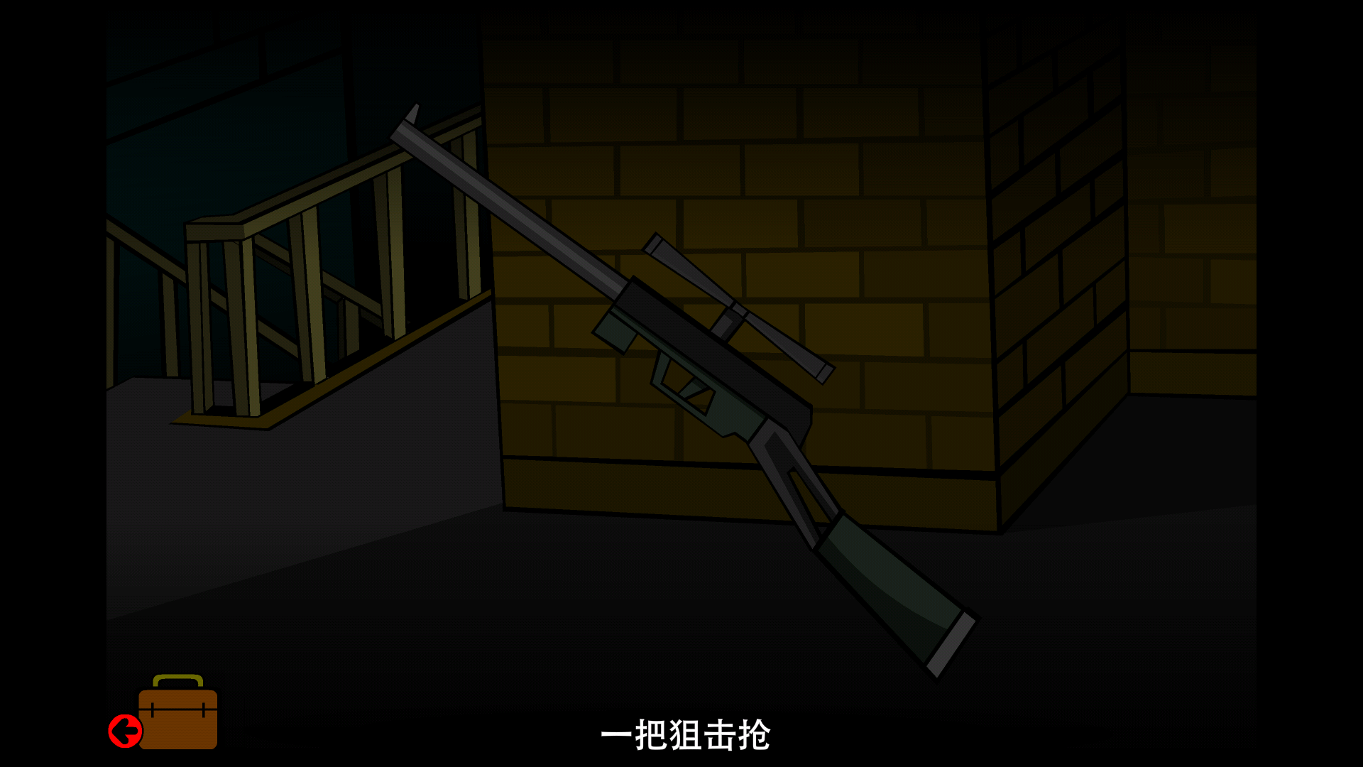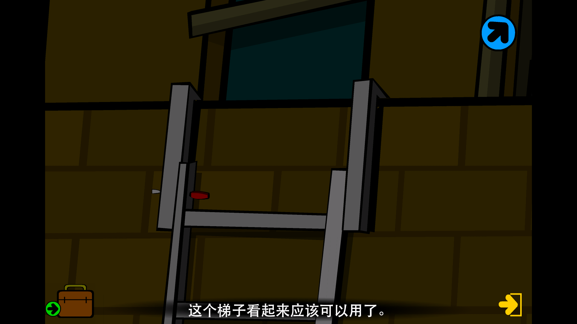 接下来我们向左转弯,能看到有一把梯子通往楼下。不过这梯子有些损坏,我们可以用工具包里的工具先将它临时修好,然后再拿去使用。