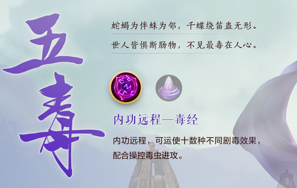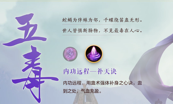 在《剑网3缘起》里,五毒属于法师定位的职业,该职业有两套心法可供选择,分别是【补天诀】和【毒经】。