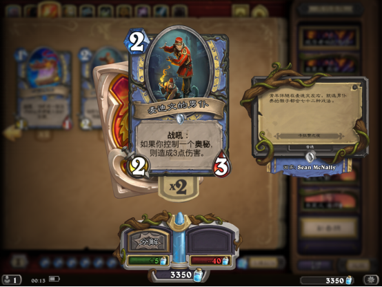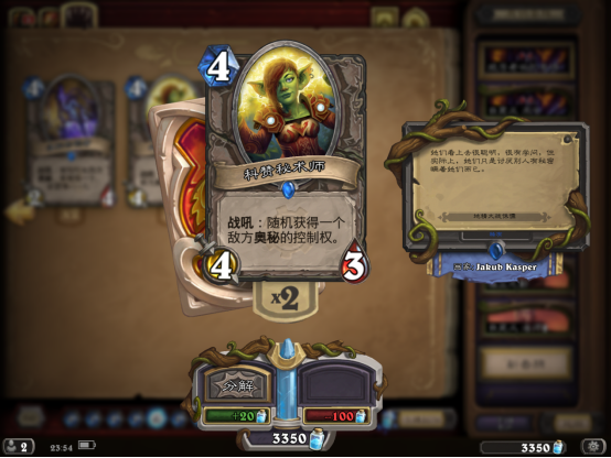 奥秘吞噬者和科赞秘术师这两张随从牌,主要是用来针对boss的一个强力奥秘——该奥秘的效果为:当有敌人发起攻击时,会对其余所有敌人造成5点伤害(只要不派随从进行攻击,这个奥秘就不会被触发)。奥秘吞噬者能够直接清除boss的奥秘,并将其转化为自身的攻击力与生命值加成;科赞秘术师则可以把boss的奥秘窃取过来为己所用。由于这两张随从对这关boss有着极强的克制作用,因此我们直接将它们各带两张满编。