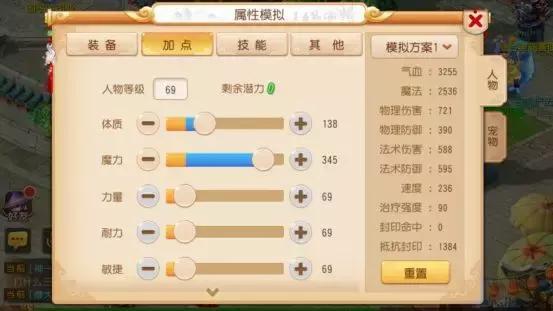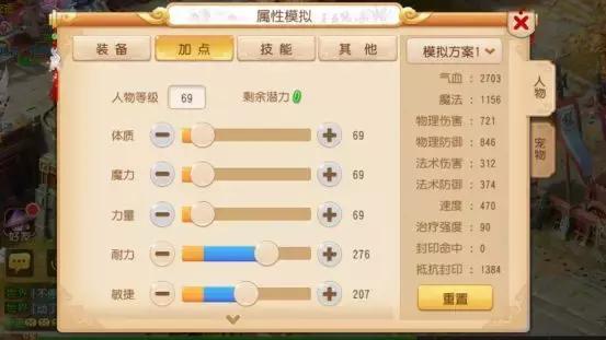 这是一种偏向抗性的加点思路,两耐力加两魔力的搭配,不管面对天宫、大唐这类物理输出门派,还是魔王、龙宫这类法系门派,都能让角色拥有不错的生存能力。再加上一点体质的加点,进一步提升了血量上限,这套加点方案在PK场景中非常值得推荐。