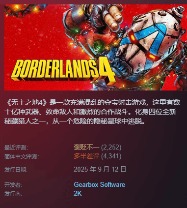 目前暂无官方数据可佐证相关说法的真实性。依据市场调研机构Circana上月发布的报告,《无主之地4》在今年美国游戏销量榜上位列第4,排在《战地6》《NBA 2K26》与《怪物猎人:荒野》之后。而Take-Two的首席执行官斯特劳斯·泽尔尼克在近期的财报会议中向投资者透露,这款游戏的销量成绩“未达他们的预期”。