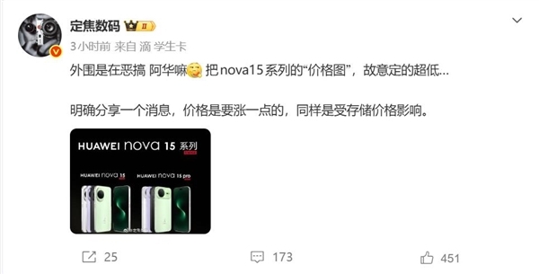 对广大消费者而言,nova 15系列除了外观颜值与影像表现之外,价格同样是大家关注的一大重点。博主定焦数码表示,该系列价格会略有上调,主要原因是受到存储芯片价格波动的影响。