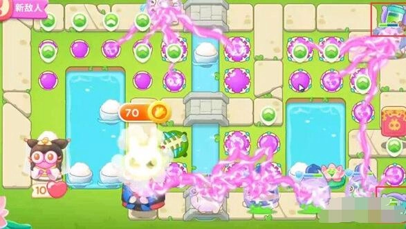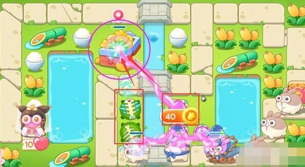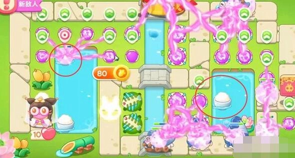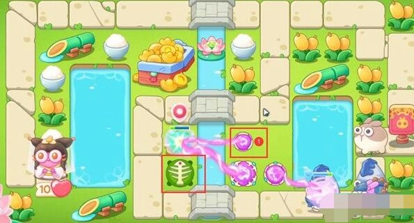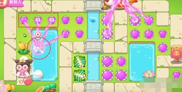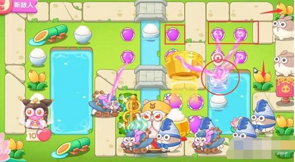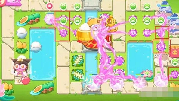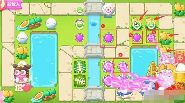 6、在第四波时,我们先将1个魔法球进行升级,然后去打米饭,接着放置2个魔法球。等右边的图开启后,再放置两个魔法球,与此同时,继续击打附近的道具。