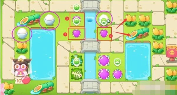 4、清理道具之后,依照123的顺序放置魔法球。3号位置原本是道具,需用1号和2号位置的魔法球将其打掉,之后再放置魔法球。利用3号位置开启右边的图。